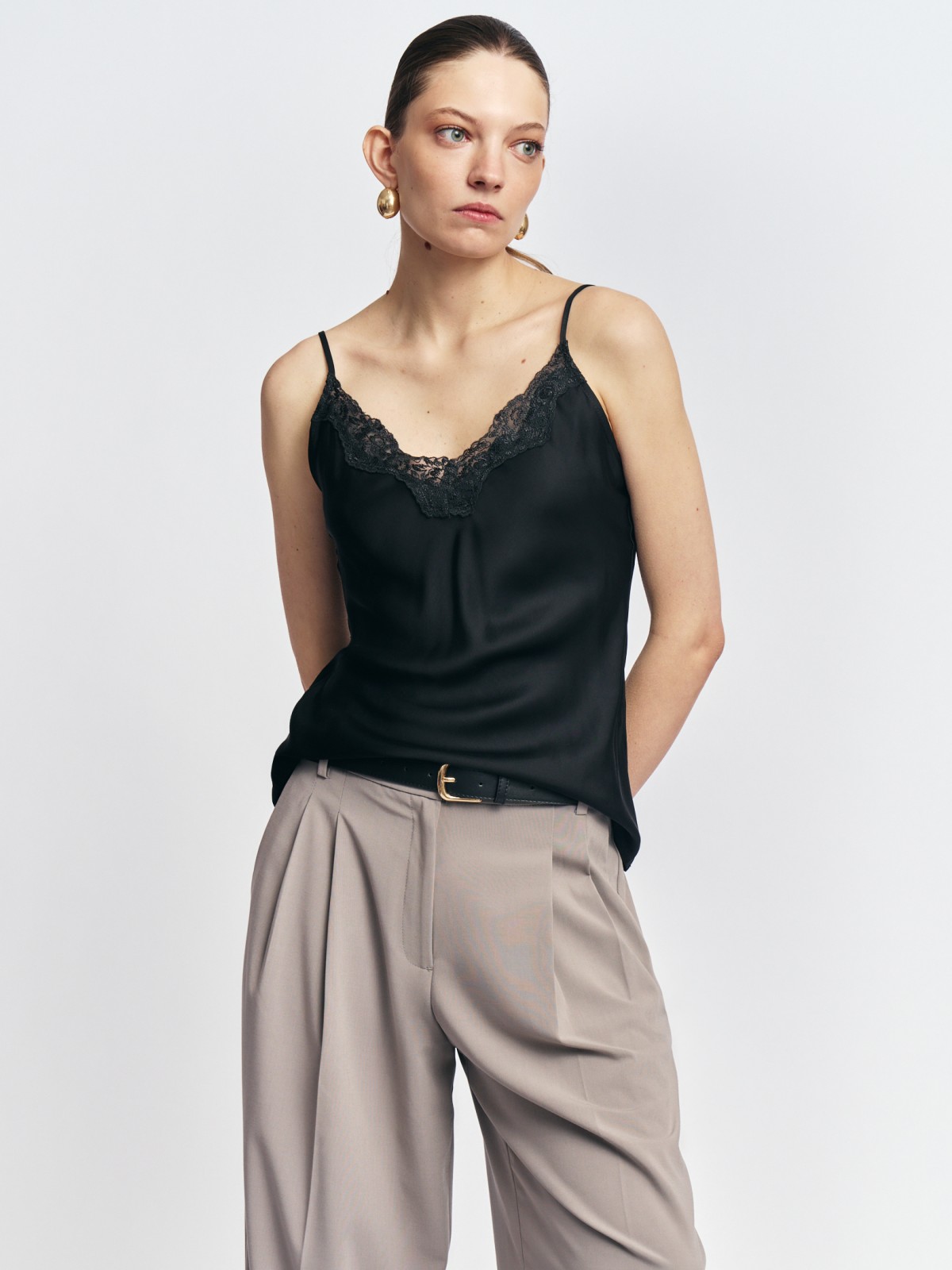 На фото: платье-комбинация миди в бельевом стиле, топ-блузка с кружевом на бретельках