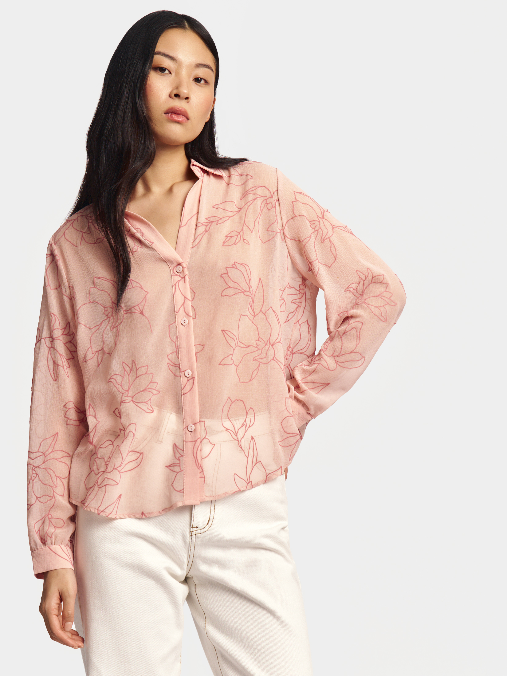 На фото: шифоновая рубашка с вырезом на груди, шифоновая блузка с воланами и бантом