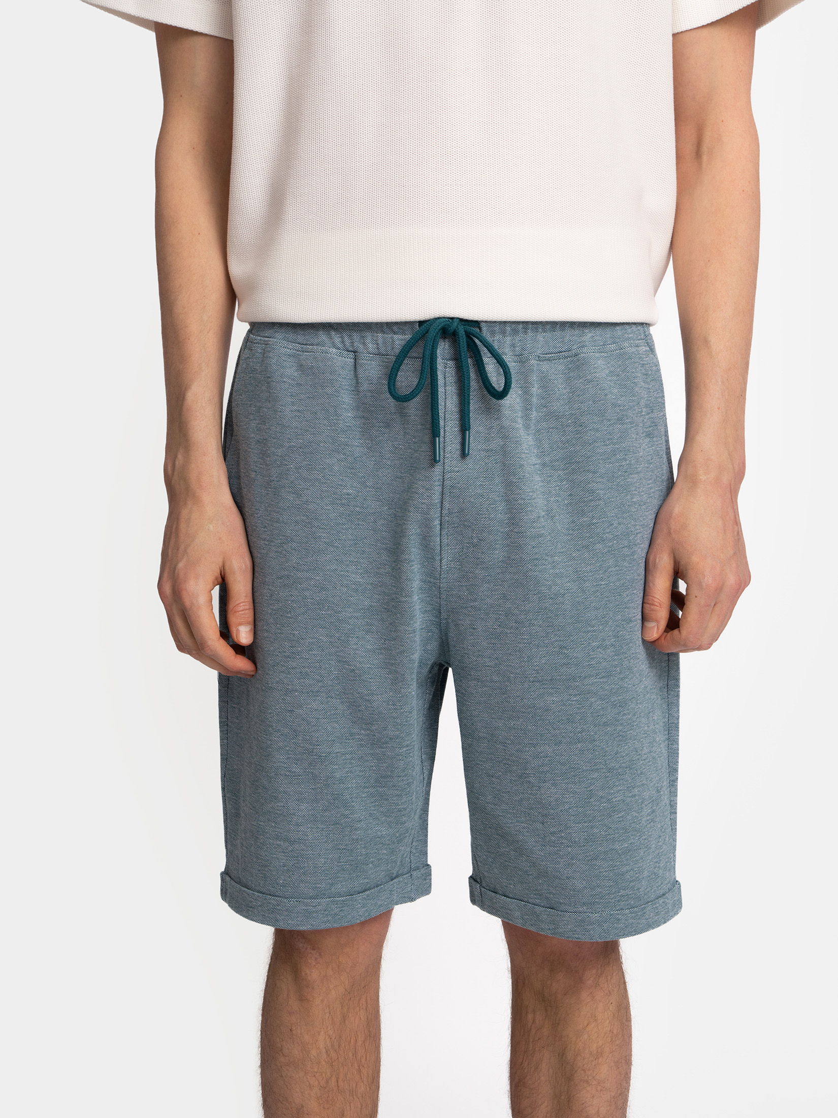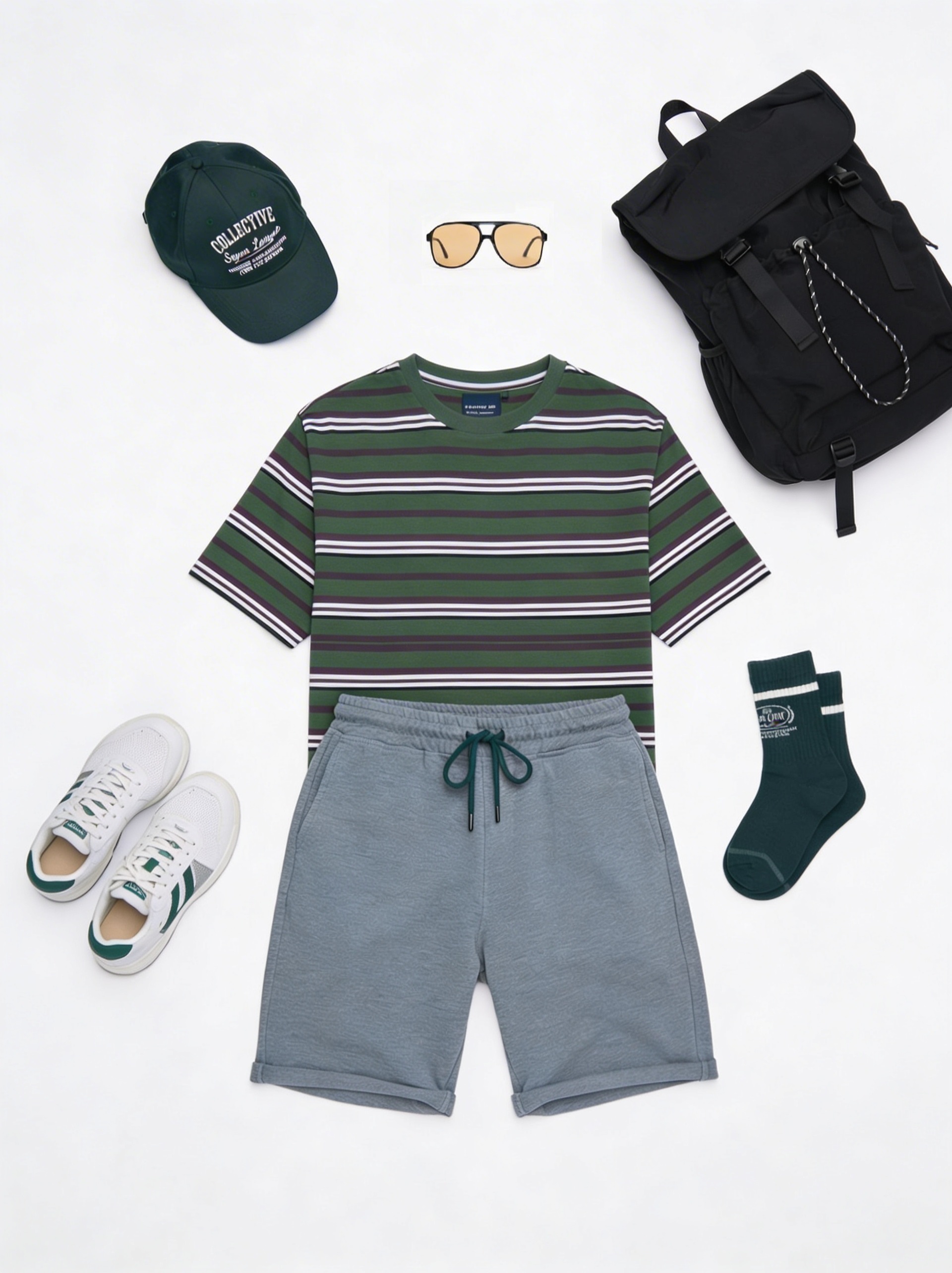 На фото: шорты кроеные, бейсболка из хлопка с полукруглым козырьком